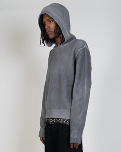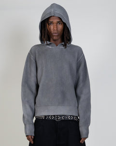 Our V1 fisherman knit pattern but with an oversized hood. Made from a 400gsm soft wool and cotton blend. It is treated with a unique water dye process to create our signature charcoal color. Has a slightly cropped fit and elongated sleeves.
