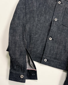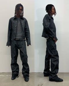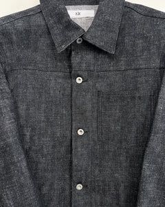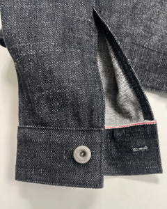 Made from 18oz salt & pepper Japanese selvedge denim. The construction features two chest pockets, a hidden inside pocket, and back waist adjusters. The button closure uses aged stone double prong Japanese hardware. It has clean finish sewing throughout the garment, with the selvedge id on cuffs and inner waist. Made in Los Angeles.