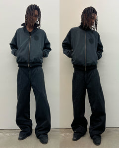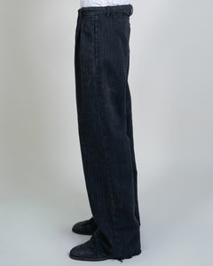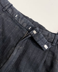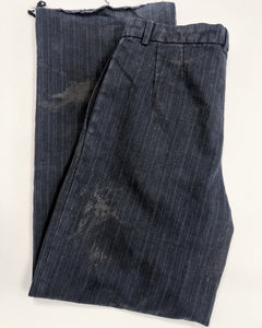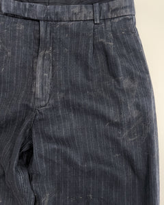 Made of 100% pinstripe wool and designed with a relaxed fit. For a tailored feel, there is a hook & eye closure with a zipper fly, single pleats along the front upper, front slant pockets and back welt pockets. Detailed with a hand staining process and raw hems making no two pairs completely alike. Made in Los Angeles.